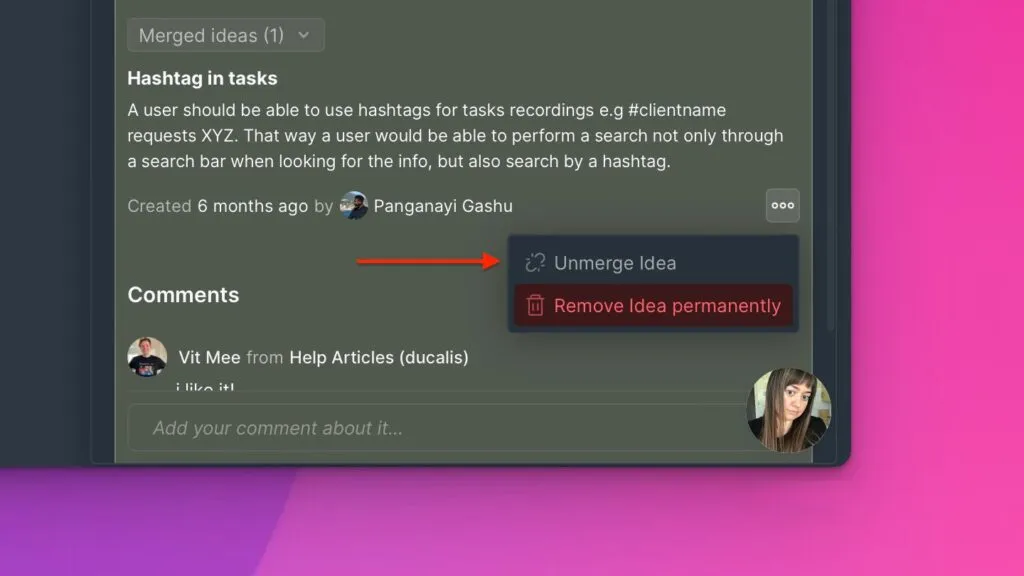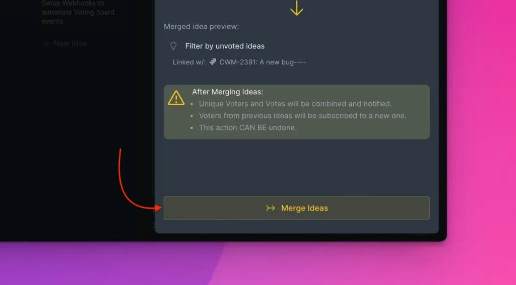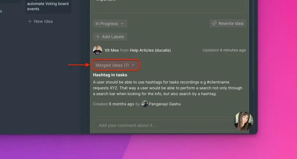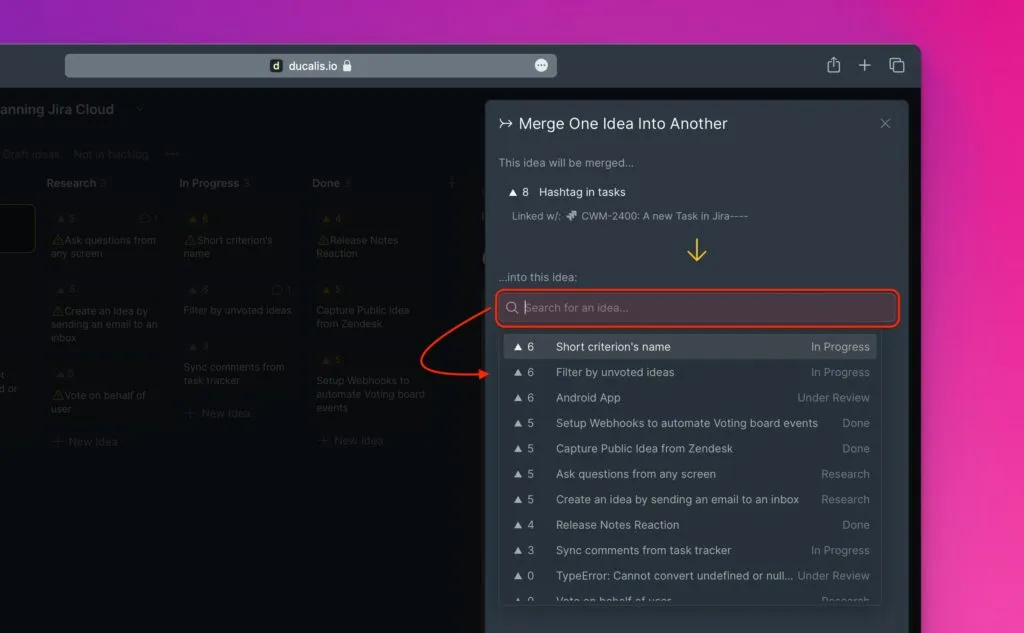 Чтобы избежать дублирующихся идей на ваших Досках идей, мы добавили возможность объединять дублирующиеся идеи.