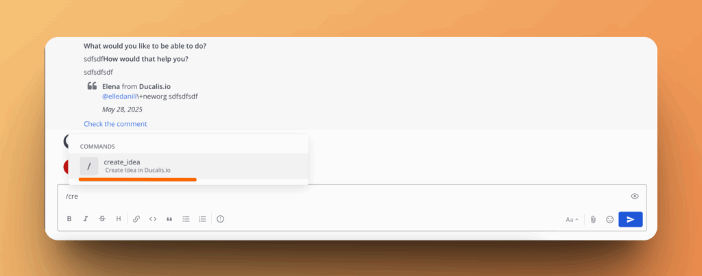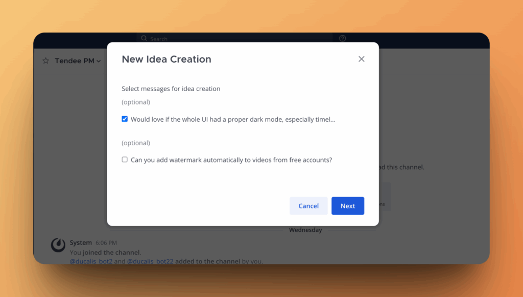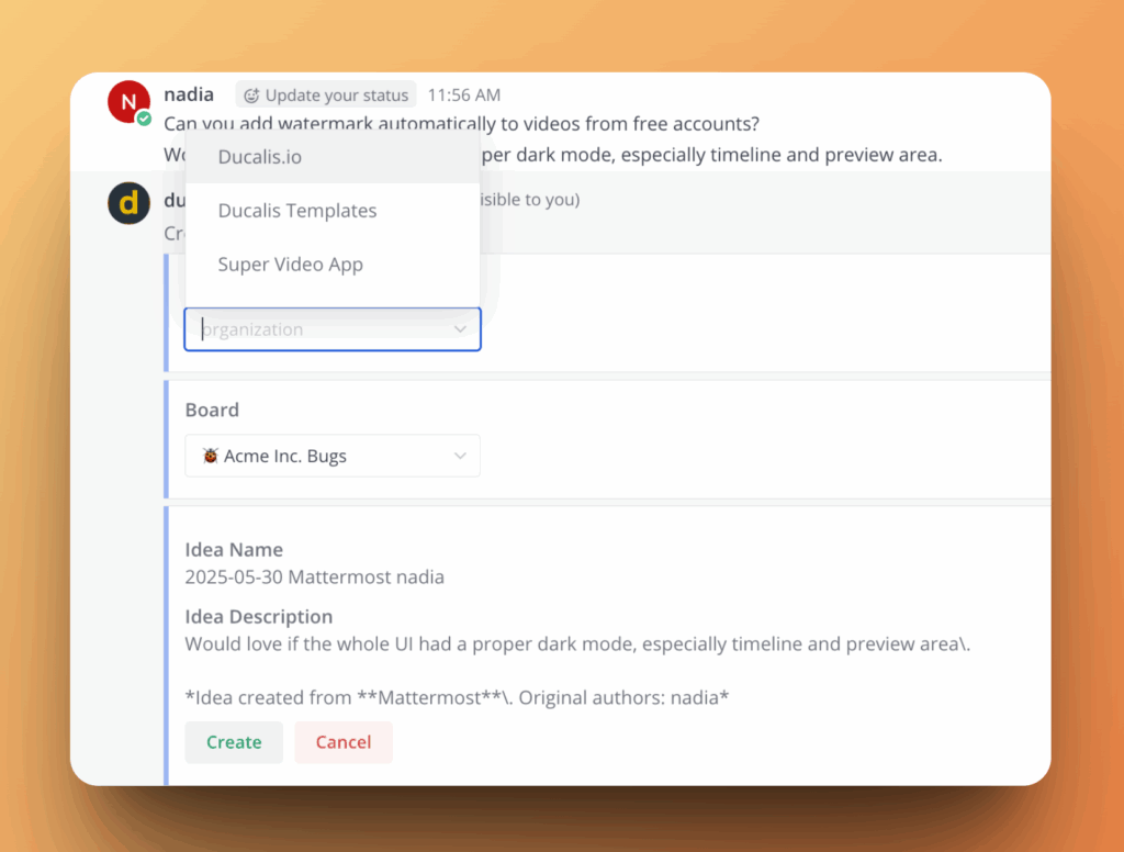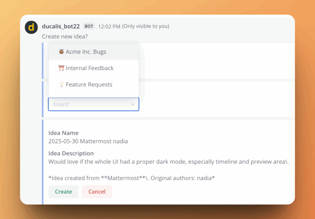 Если у вас есть каналы для обратной связи по продукту в вашем Mattermost аккаунте, вы можете превратить эту обратную связь в публичные идеи для вашей доски голосования. Интеграция Prioplan с Mattermost позволяет создавать публичную идею из канала Mattermost.