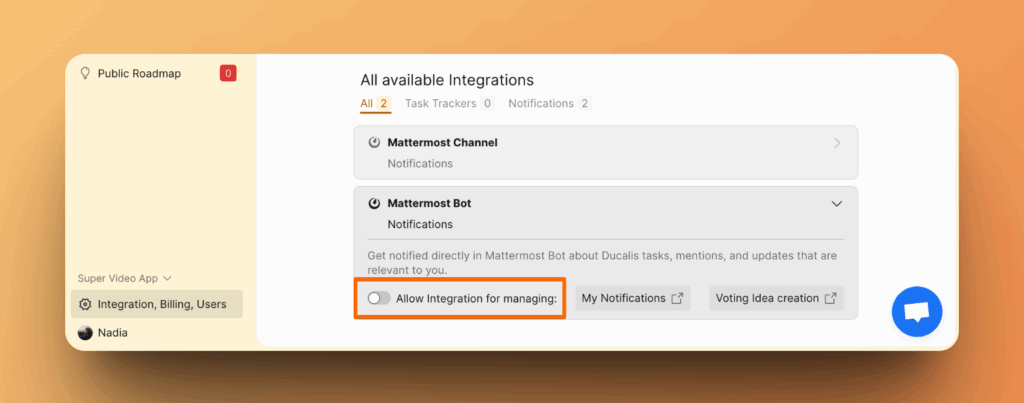2. Нажмите enable Mattermost Integration (включить интеграцию Mattermost).