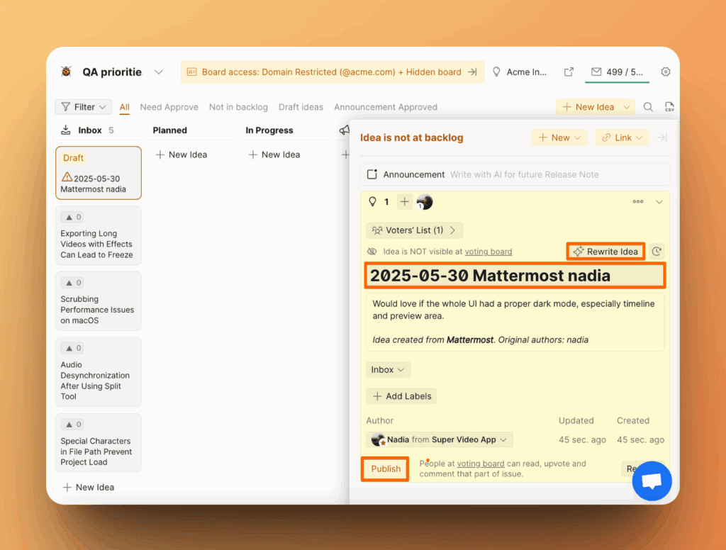 - Перейдите по ссылке на идею на доску Prioplan. Вам нужно будет дать идее название, отредактировать её при необходимости, а затем опубликовать.