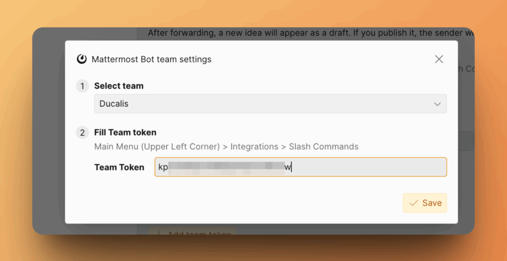 9. Выберите Team (Команду) и вставьте token (токен). Нажмите Save (Сохранить).
