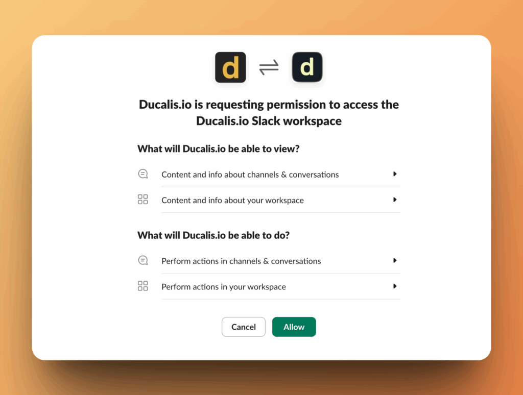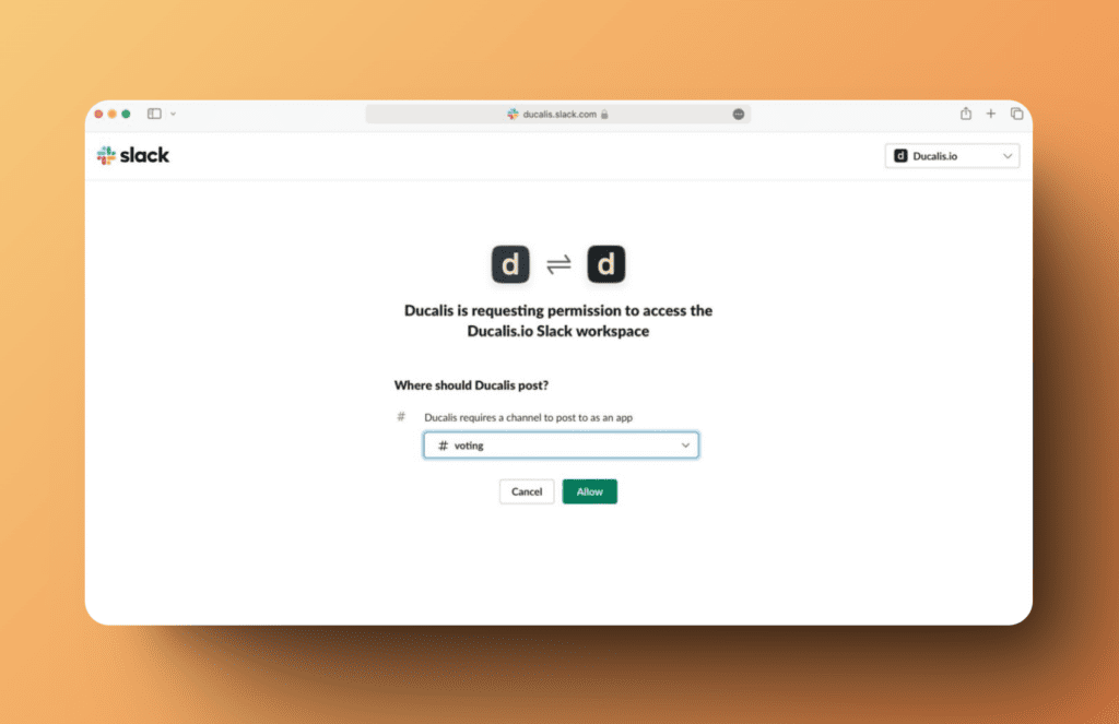 - Авторизуйте Prioplan для доступа к вашему рабочему пространству Slack, а также выберите канал, в котором хотите получать уведомления. Затем нажмите Allow (Разрешить), чтобы продолжить.