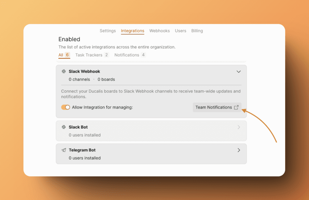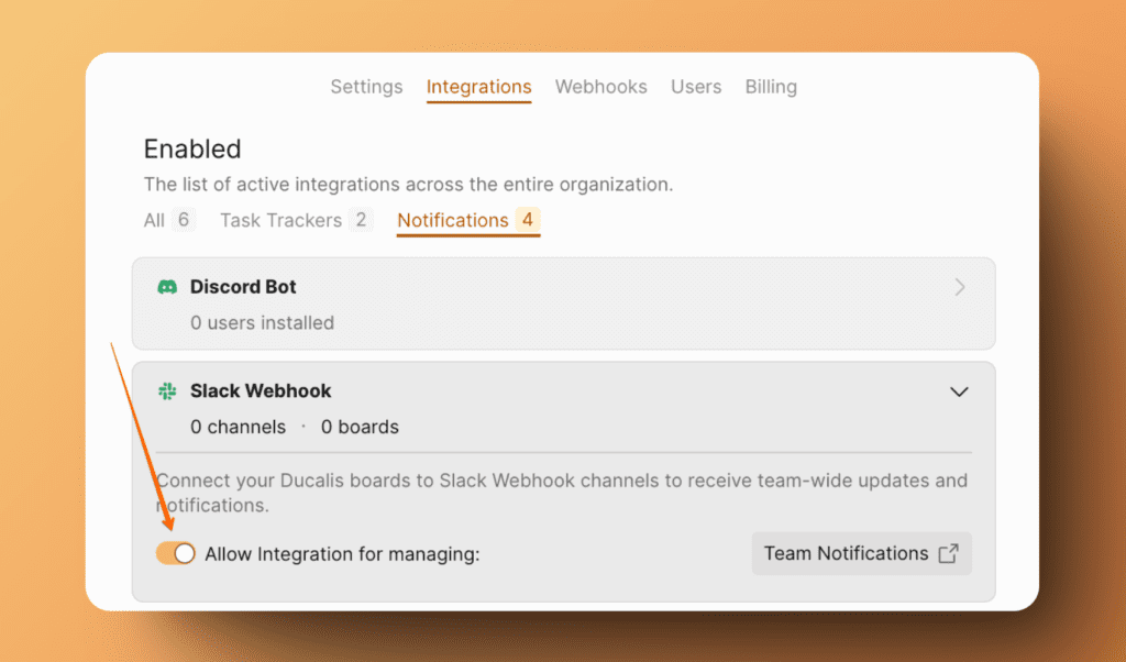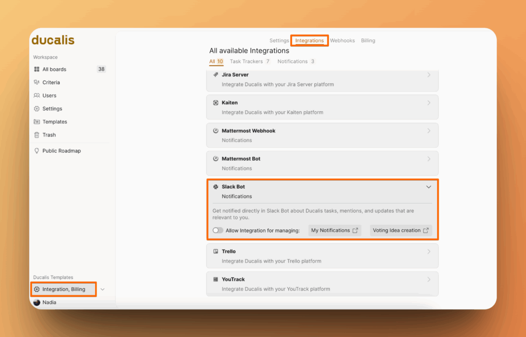 - Вы будете перенаправлены в раздел «Интеграции». Найдите Slack bot и активируйте переключатель.