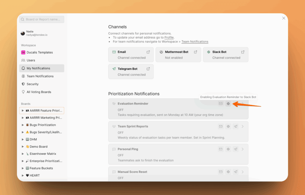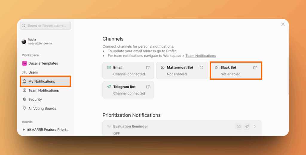 Будьте в курсе событий, происходящих в ваших процессах приоритизации и на Доске идей, получая уведомления в вашем рабочем пространстве Slack.