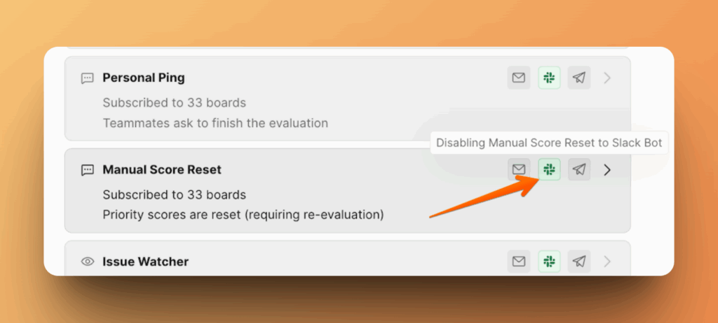 - Вернитесь в My Notifications (Мои уведомления) и наведите курсор на иконку Slack рядом с любым уведомлением, затем нажмите на неё.