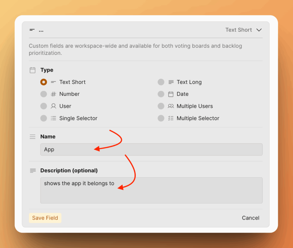 При создании кастомного поля не забудьте указать имя, которое идентифицирует его назначение, и кратко объясните, что оно представляет (описание будет появляться в приложении при наведении курсора на название поля).