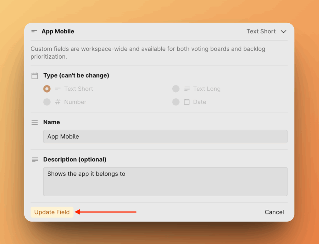 1. Выберите поле, которое хотите изменить, и внесите изменения. Вы можете изменить имя и описание. Нажмите Update Field (Обновить поле).
