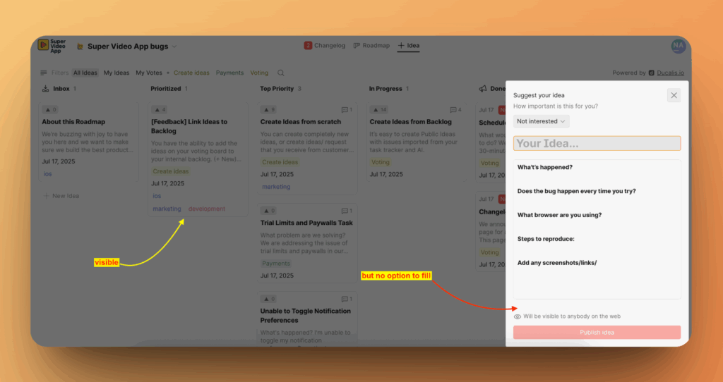 1. Вы можете выбрать, могут ли ваши внешние пользователи заполнять это поле при создании новой идеи.