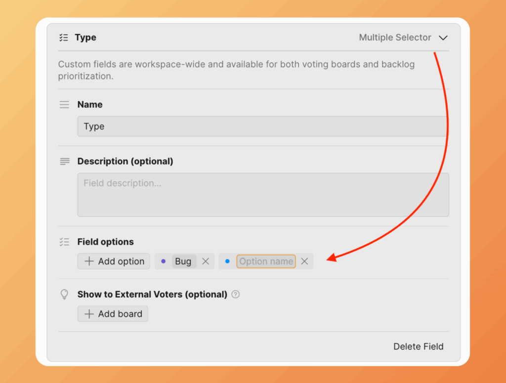 При создании полей с типом Select (Выбор) вы можете добавить к ним опции — они называются опциями поля.