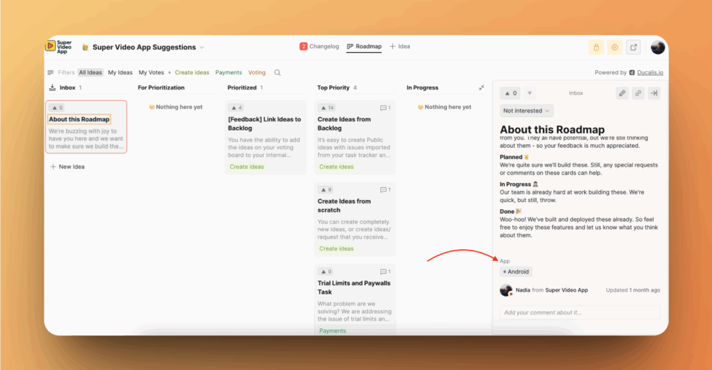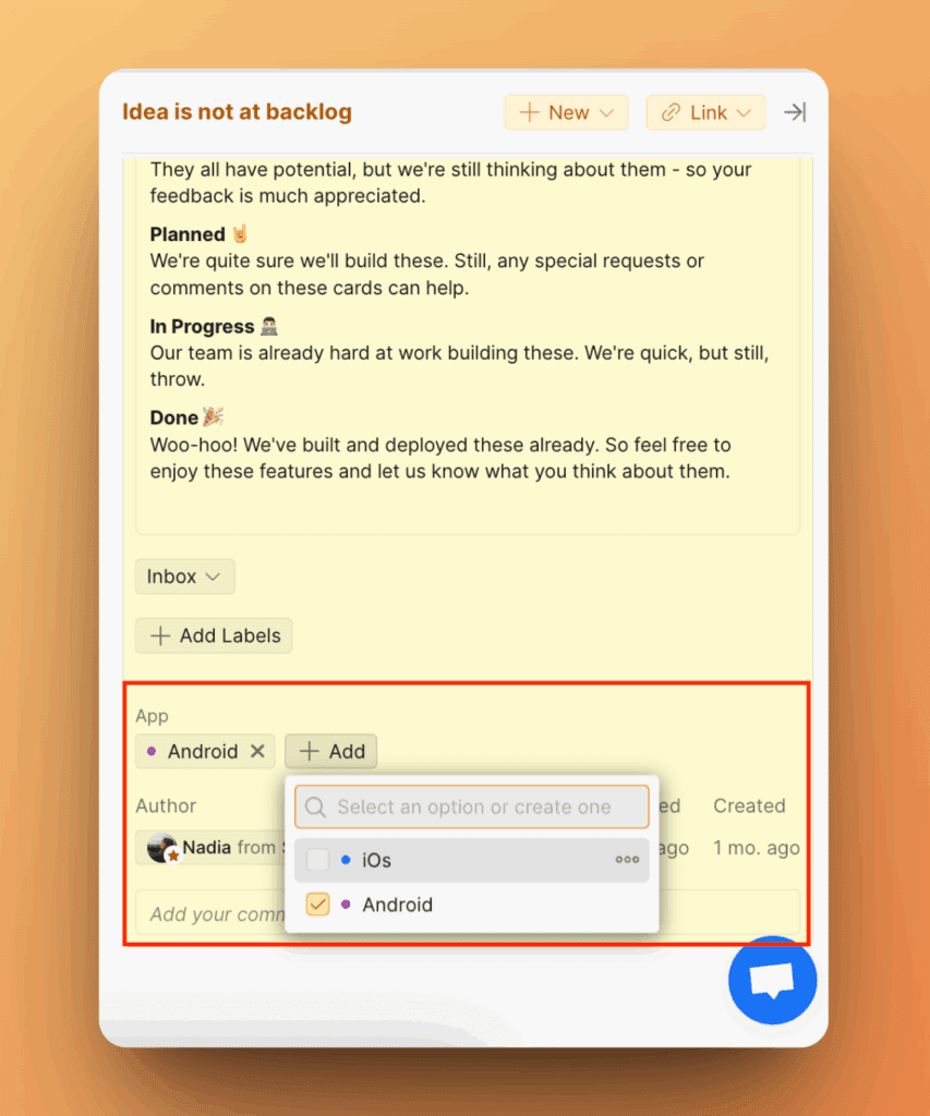 Созданные вами кастомные поля будут отображаться в Задачах бэклога и Идеях Доски идей.