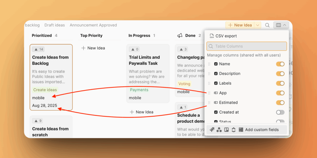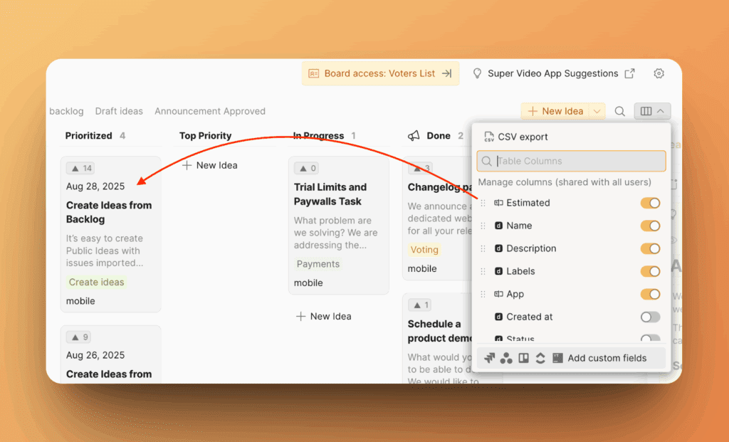 2. Выберите кастомные поля, которые вы хотите видеть в публичном канбан-представлении Доски идей.