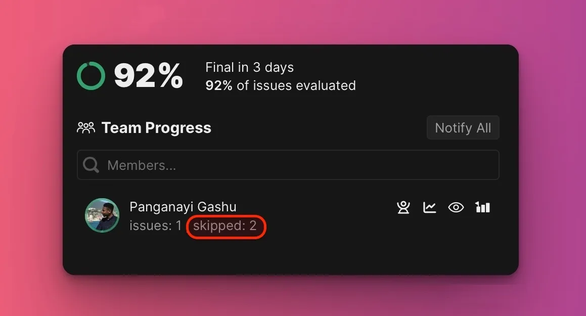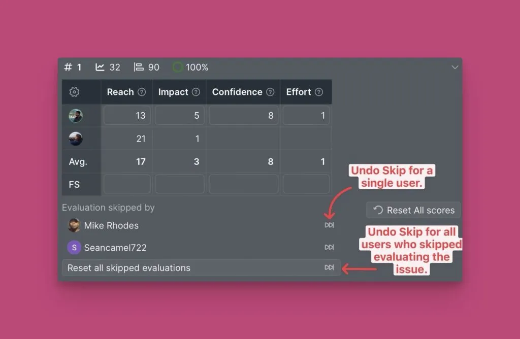 Админы могут выполнить Undo Skip (Отменить пропуск) от имени своих коллег, возвращая пропущенную задачу на повторную оценку. Это удобно, когда пропущенная задача была отредактирована и требует повторной оценки.