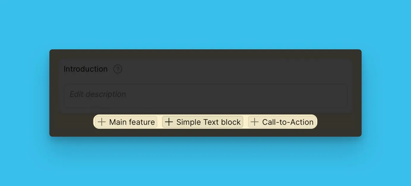 Добавьте столько блоков Main Feature (Главная функция), Simple Text (Простой текст) и CTA (Призыв к действию), сколько необходимо.