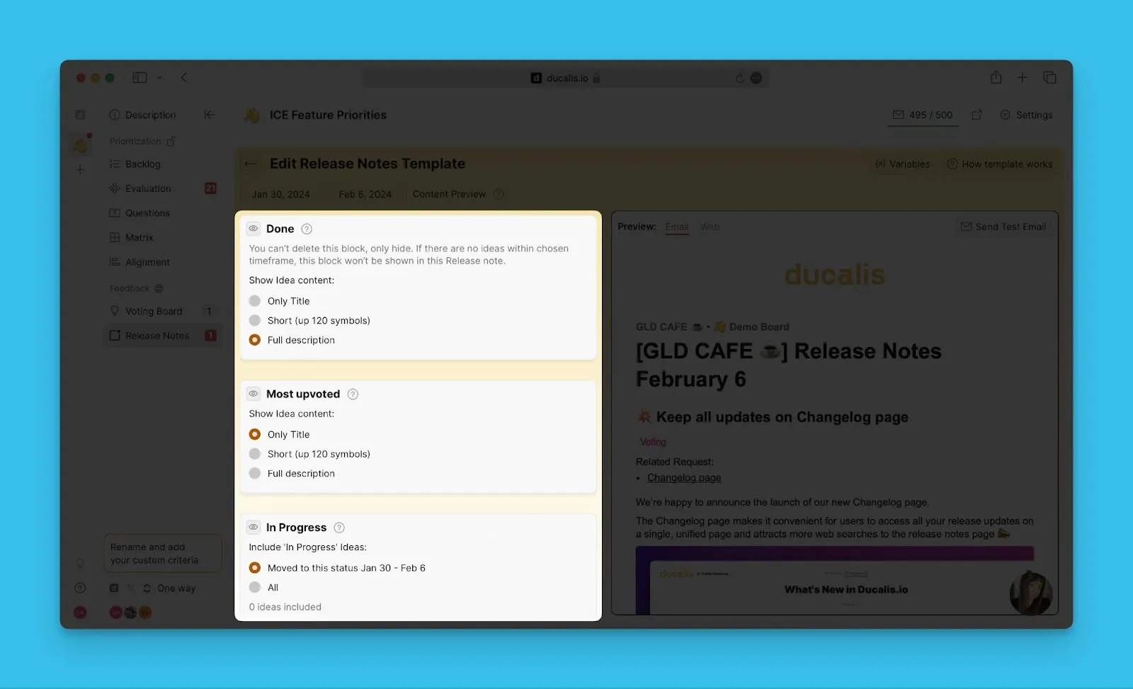 Выберите, какие блоки Voting Board Status (Статус Доски идей) включить, и расположите их в предпочитаемом порядке.