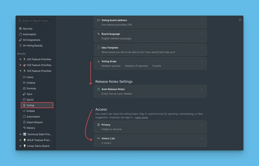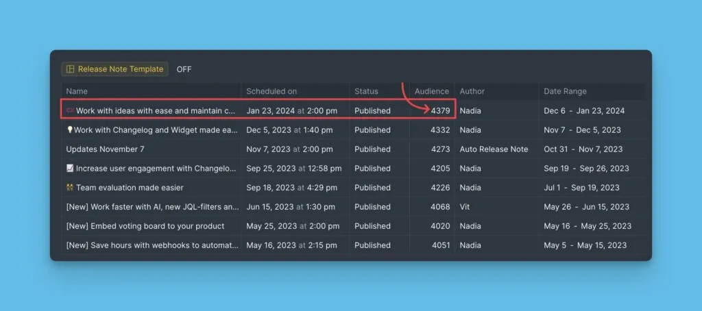 Все новые Голосующие, которые подписываются на вашу Доску идей, автоматически добавляются в список подписчиков на Релиз ноутсы. Эта функция включена по умолчанию, чтобы новые пользователи получали обновления вашего продукта без ручного управления списком.